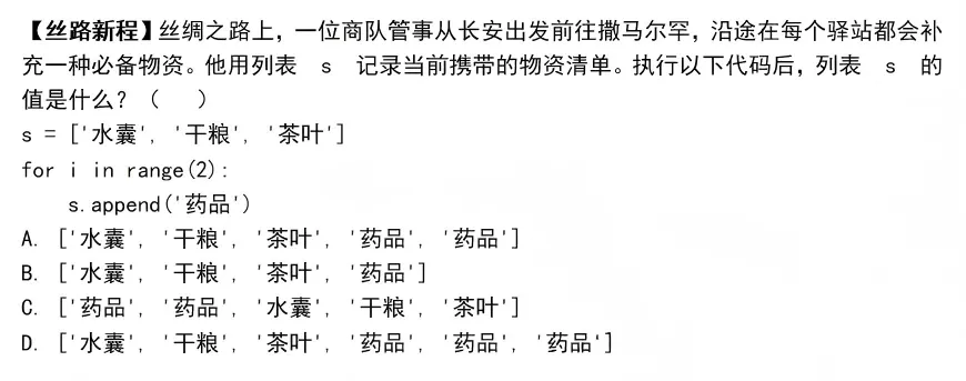 s = ['水囊', '干粮', '茶叶']for i in range(2):s.append('药品')
