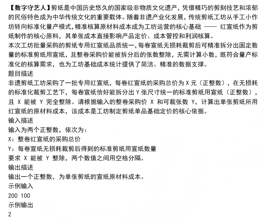 题目:根据整卷采购价X和可裁张数Y(保证X能被Y整除),求单张成本。