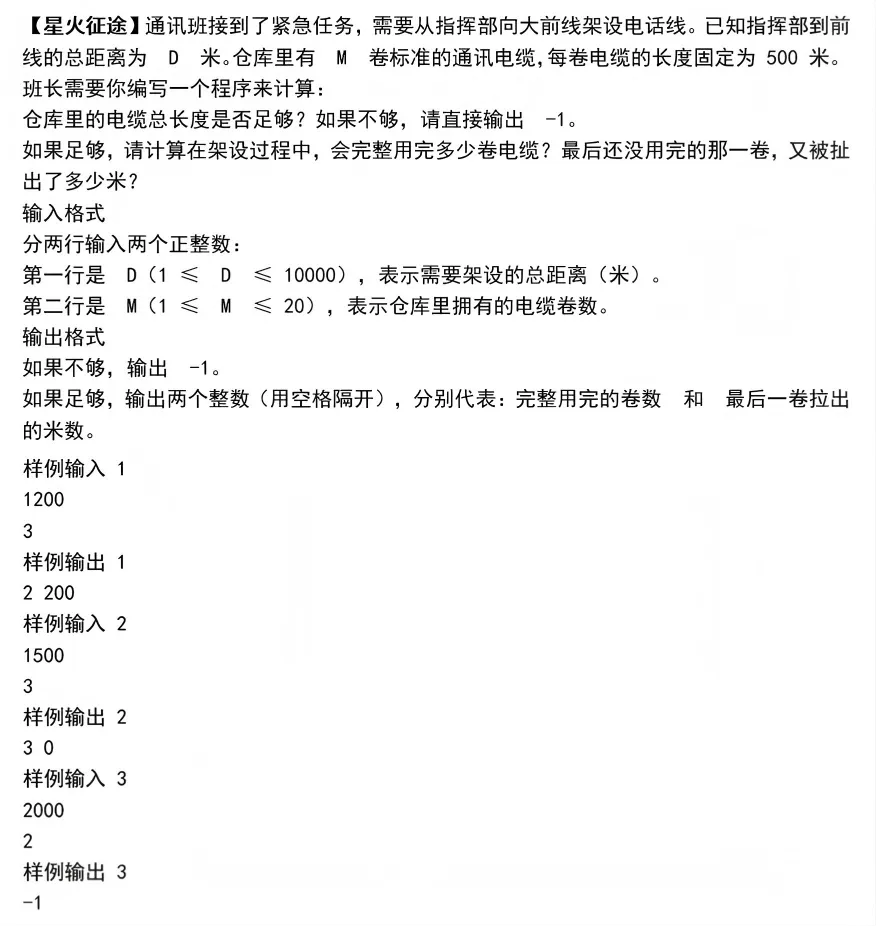 题目:根据总距离D和电缆卷数M(每卷500米),判断是否足够。若够,输出完整用完的卷数和最后一卷所用米数。