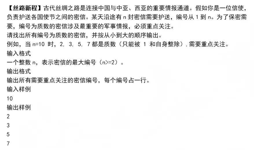 n = int(input())for num in range(2, n + 1):is_prime = Truefor j in range(2, int(num ** 0.5) + 1):if num % j == 0:is_prime = Falsebreakif is_prime:print(num)