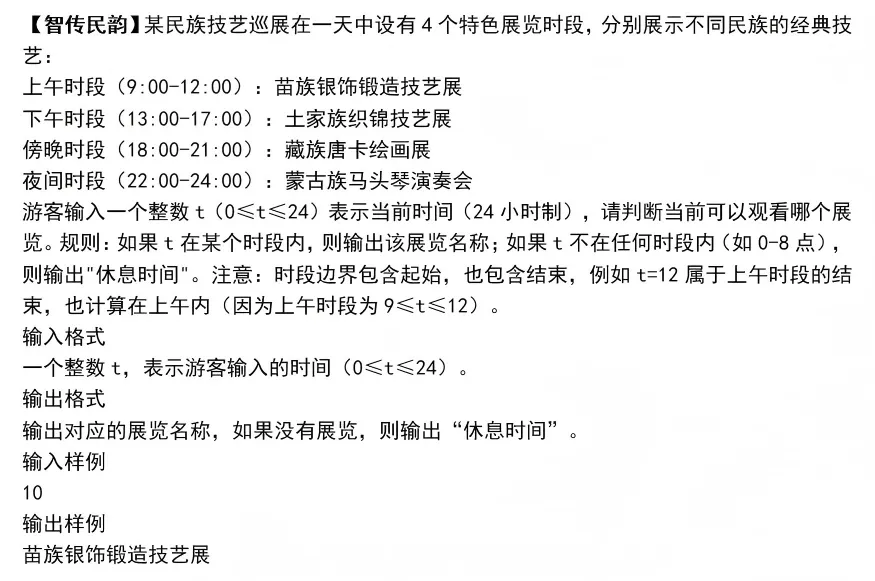 题目:根据输入的整数时间t(0-24),输出对应的展览名称或“休息时间”。