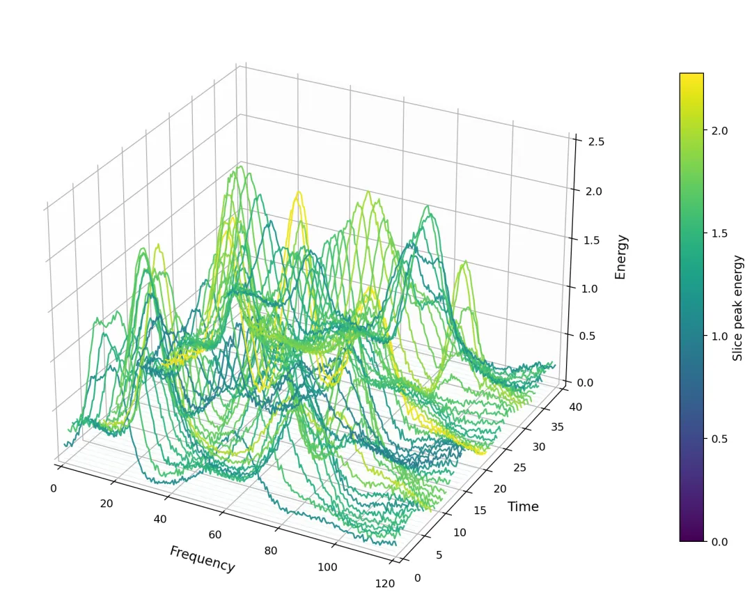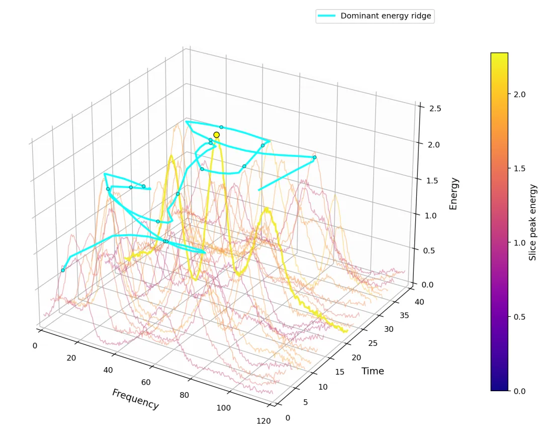 import osimport numpy as npimport matplotlib.pyplot as pltfrom matplotlib import cmfrom matplotlib.colors import Normalize# 0. 输出目录OUTDIR = "waterfall_demo_output_clean"os.makedirs(OUTDIR, exist_ok=True)# 1. 构造模拟的时间-频率-能量数据def gaussian(x, mu, sigma): return np.exp(-0.5 * ((x - mu) / sigma) ** 2)def moving_average_1d(x, w=5): if w <= 1: return x.copy() kernel = np.ones(w) / w return np.convolve(x, kernel, mode="same")def generate_tf_energy(nt=90, nf=260, seed=2026): rng = np.random.default_rng(seed) t = np.linspace(0, 40, nt) # time f = np.linspace(0, 120, nf) # frequency E = np.zeros((nt, nf), dtype=float) for i, ti in enumerate(t): # 成分1:低频起伏带 c1 = 18 + 10 * np.sin(2 * np.pi * ti / 18.0) a1 = 1.2 + 0.5 * np.cos(2 * np.pi * ti / 11.0) band1 = a1 * gaussian(f, c1, 4.5) # 成分2:中高频摆动带 c2 = 68 + 13 * np.cos(2 * np.pi * (ti - 5) / 15.0) a2 = 1.0 + 0.4 * np.sin(2 * np.pi * ti / 9.5) band2 = a2 * gaussian(f, c2, 6.5) # 成分3:斜向 chirp 型能量脊 c3 = 10 + 1.7 * ti a3 = 0.8 + 0.25 * np.sin(2 * np.pi * ti / 8.0) band3 = a3 * gaussian(f, c3, 3.0) # 局部强脉冲热点 burst = ( 1.8 * gaussian(ti, 10.0, 1.2) * gaussian(f, 88, 5.0) + 2.2 * gaussian(ti, 21.0, 1.5) * gaussian(f, 52, 4.0) + 1.6 * gaussian(ti, 31.0, 1.0) * gaussian(f, 97, 3.8) ) # 背景起伏 background = ( 0.15 + 0.10 * np.sin(0.15 * f + 0.55 * ti) + 0.06 * np.cos(0.10 * f - 0.35 * ti) ) # 噪声 noise = 0.05 * rng.normal(size=nf) E[i, :] = band1 + band2 + band3 + burst + background + noise E = np.clip(E, 0, None) # 沿时间方向平滑 for j in range(nf): E[:, j] = moving_average_1d(E[:, j], w=5) return t, f, E# 2. 基础版瀑布图def plot_basic_waterfall(t, f, E, out_png): fig = plt.figure(figsize=(12, 8), dpi=180) ax = fig.add_subplot(111, projection="3d") idx = np.arange(0, len(t), 2) norm = Normalize(vmin=E.min(), vmax=E.max()) cmap = cm.viridis for i in idx: color = cmap(norm(E[i].max())) ax.plot( f, np.full_like(f, t[i]), E[i], color=color, lw=1.4, alpha=0.95 ) ax.plot( f, np.full_like(f, t[i]), np.zeros_like(f), color=color, lw=0.6, alpha=0.12 ) ax.set_xlabel("Frequency", fontsize=12, labelpad=10) ax.set_ylabel("Time", fontsize=12, labelpad=10) ax.set_zlabel("Energy", fontsize=12, labelpad=8) ax.view_init(elev=28, azim=-62) ax.set_xlim(f.min(), f.max()) ax.set_ylim(t.min(), t.max()) ax.set_zlim(0, E.max() * 1.10) ax.xaxis.pane.set_alpha(0.06) ax.yaxis.pane.set_alpha(0.06) ax.zaxis.pane.set_alpha(0.02) ax.grid(True, alpha=0.25) mappable = cm.ScalarMappable(norm=norm, cmap=cmap) mappable.set_array([]) cbar = plt.colorbar(mappable, ax=ax, pad=0.08, shrink=0.78) cbar.set_label("Slice peak energy", fontsize=11) plt.tight_layout() plt.savefig(out_png, bbox_inches="tight")# 3. 重新整理后的进阶版瀑布图def plot_advanced_waterfall(t, f, E, out_png): fig = plt.figure(figsize=(12, 8), dpi=180) ax = fig.add_subplot(111, projection="3d") # 只抽取较少切片,避免太密 idx = np.arange(0, len(t), 4) norm = Normalize(vmin=E.min(), vmax=E.max()) cmap = cm.plasma peak_each_time = E.max(axis=1) top_idx = np.argsort(peak_each_time)[-3:] # 最强3个切片高亮 for i in idx: color = cmap(norm(E[i].max())) lw = 1.0 alpha = 0.45 if i in top_idx: lw = 2.2 alpha = 0.95 ax.plot( f, np.full_like(f, t[i]), E[i], color=color, lw=lw, alpha=alpha ) # 主能量脊线:每个时刻最大能量对应的频率 ridge_f = f[np.argmax(E, axis=1)] ridge_z = E.max(axis=1) ridge_f_smooth = moving_average_1d(ridge_f, w=7) ridge_z_smooth = moving_average_1d(ridge_z, w=7) # 主脊线本体 ax.plot( ridge_f_smooth, t, ridge_z_smooth + 0.03 * E.max(), color="cyan", lw=2.4, alpha=0.95, label="Dominant energy ridge" ) # 加少量散点,让这条线更有 3D 路径感 step = 6 ax.scatter( ridge_f_smooth[::step], t[::step], ridge_z_smooth[::step] + 0.03 * E.max(), s=18, color="cyan", edgecolors="black", linewidths=0.4, alpha=0.95 ) # 只标出一个全局峰值,不再写 Peak1 Peak2 g_idx = np.argmax(peak_each_time) g_f = f[np.argmax(E[g_idx])] g_z = E[g_idx].max() ax.scatter( [g_f], [t[g_idx]], [g_z], s=52, color="yellow", edgecolors="black", linewidths=0.8, zorder=10 ) ax.set_xlabel("Frequency", fontsize=12, labelpad=10) ax.set_ylabel("Time", fontsize=12, labelpad=10) ax.set_zlabel("Energy", fontsize=12, labelpad=8) ax.set_xlim(f.min(), f.max()) ax.set_ylim(t.min(), t.max()) ax.set_zlim(0, E.max() * 1.10) # 视角略调整 ax.view_init(elev=27, azim=-58) ax.xaxis.pane.set_alpha(0.05) ax.yaxis.pane.set_alpha(0.05) ax.zaxis.pane.set_alpha(0.02) ax.grid(True, alpha=0.18) mappable = cm.ScalarMappable(norm=norm, cmap=cmap) mappable.set_array([]) cbar = plt.colorbar(mappable, ax=ax, pad=0.08, shrink=0.78) cbar.set_label("Slice peak energy", fontsize=11) ax.legend(loc="upper right", frameon=True, fontsize=10) plt.tight_layout() plt.savefig(out_png, bbox_inches="tight")# 4. 主程序def main(): t, f, E = generate_tf_energy() basic_png = os.path.join(OUTDIR, "waterfall_basic.png") adv_png = os.path.join(OUTDIR, "waterfall_advanced_clean.png") plot_basic_waterfall(t, f, E, basic_png) plot_advanced_waterfall(t, f, E, adv_png)if __name__ == "__main__": main()