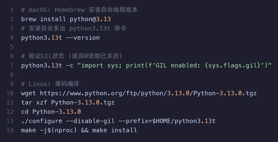 macOS用户最省事,Homebrew已经收录了自由线程版本。装完之后你的系统里会多出一个`python3.13t`命令——注意末尾那个`t`,就是free-threaded的缩写。Linux用户可以通过源码编译,configure时加上`--disable-gil`参数。