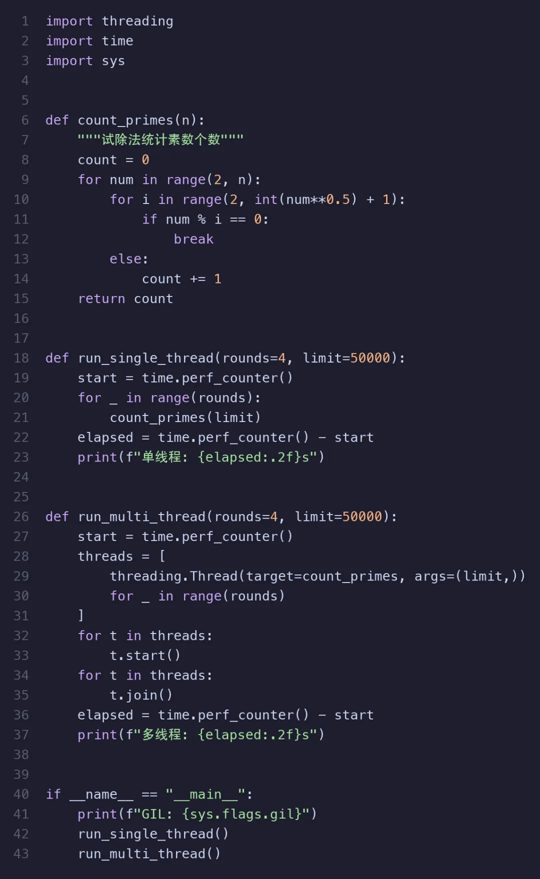 在标准Python 3.13里,多线程版本和单线程几乎一样慢——GIL让四个线程只能轮流执行,没有任何并行加速。这是我跑了无数次都确认过的结论。