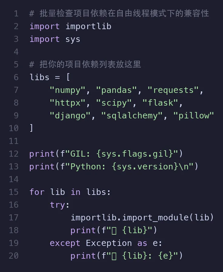 建议你在考虑切换之前,先跑一轮兼容性检查。把项目依赖导出来,逐个在自由线程模式下`import`一遍。如果有C扩展的依赖,还要跑一遍核心功能测试。这比盲目升级然后在线上爆炸要好得多。