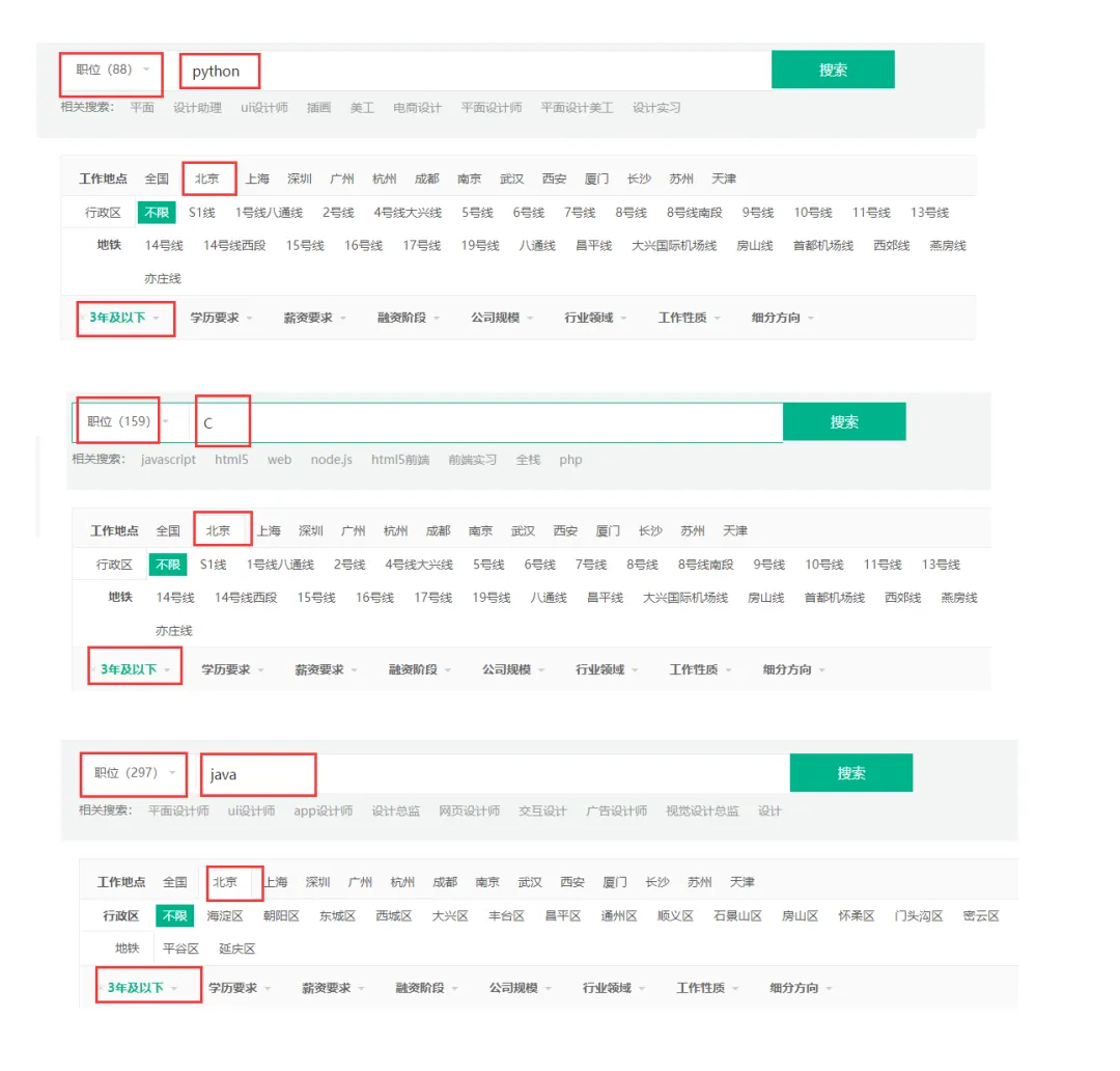 就拿北京地区来说,工作3年以内的岗位里,专门做Python开发的只有88个,而Java有297个,C语言有159个。