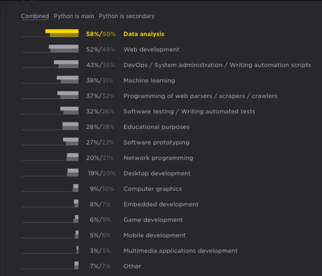 有调查显示,58%的人用Python处理数据,52%用来做网站,43%用它简化工作流程,38%用在AI相关的事情上,能看出来它是真的实用。