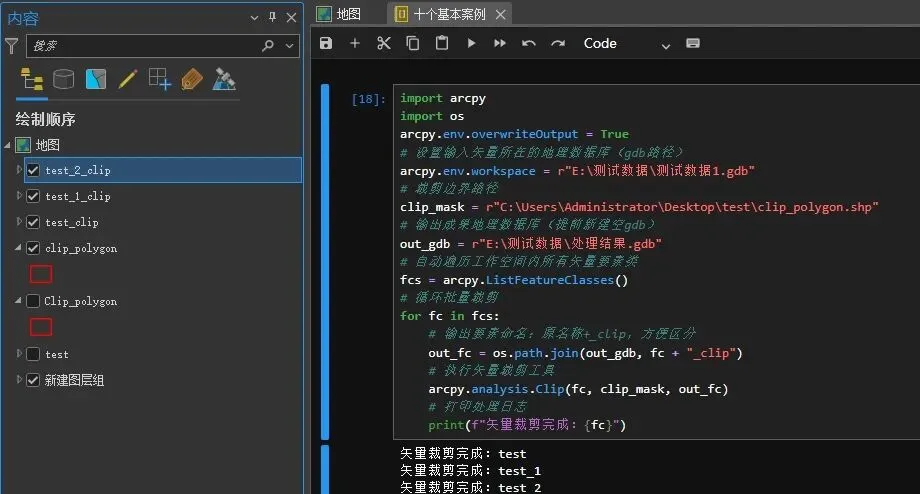 import arcpyimport osarcpy.env.overwriteOutput = True# 设置输入矢量所在的地理数据库(gdb路径)arcpy.env.workspace = r"D:\GIS项目\原始矢量数据.gdb"# 裁剪边界路径clip_mask = r"D:\GIS项目\项目边界.shp"# 输出成果地理数据库(提前新建空gdb)out_gdb = r"D:\GIS项目\裁剪后矢量成果.gdb"# 自动遍历工作空间内所有矢量要素类fcs = arcpy.ListFeatureClasses()# 循环批量裁剪for fc in fcs:# 输出要素命名:原名称+_clip,方便区分out_fc = os.path.join(out_gdb, fc + "_clip")# 执行矢量裁剪工具arcpy.analysis.Clip(fc, clip_mask, out_fc)# 打印处理日志print(f"矢量裁剪完成:{fc}")