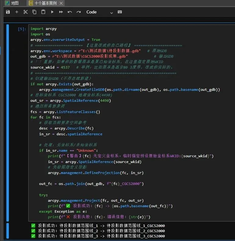 import arcpyimport osarcpy.env.overwriteOutput = True# ====================== 【这里改成你自己路径】 ======================arcpy.env.workspace = r"E:\测试数据\待投影数据.gdb" # 原始GDBout_gdb = r"E:\测试数据\CGCS2000投影成果.gdb" # 输出GDB# !!重要:如果你的数据原本是某已知坐标系,在这里指定原始WKIDsource_wkid = 4537 # 举例:比如原本是西安80 3度带,改成你实际的。# =================================================================# 创建输出GDB(不存在就新建)if not arcpy.Exists(out_gdb):arcpy.management.CreateFileGDB(os.path.dirname(out_gdb), os.path.basename(out_gdb))# 目标坐标系 CGCS2000 地理坐标系(4490)out_sr = arcpy.SpatialReference(4490)# 遍历所有要素类fcs = arcpy.ListFeatureClasses()for fc in fcs:# 获取当前要素空间参考desc = arcpy.Describe(fc)in_sr = desc.spatialReference# 处理:无坐标系/未知坐标系if in_sr.name == "Unknown":print(f"【警告】{fc} 无定义坐标系,临时指定预设原始坐标系WKID:{source_wkid}")in_sr = arcpy.SpatialReference(source_wkid)# 先给图层定义投影arcpy.management.DefineProjection(fc, in_sr)out_fc = os.path.join(out_gdb, f"{fc}_CGCS2000")try:arcpy.management.Project(fc, out_fc, out_sr)print(f"✅ 投影成功:{fc} -> {os.path.basename(out_fc)}")except Exception as e:print(f"❌ 投影失败:{fc},错误信息:{str(e)}")