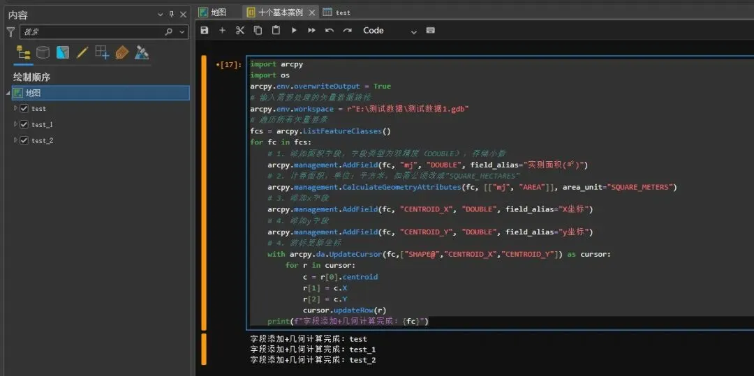 import arcpyimport osarcpy.env.overwriteOutput = True# 输入需要处理的矢量数据路径arcpy.env.workspace = r"E:\测试数据\测试数据1.gdb"# 遍历所有矢量要素fcs = arcpy.ListFeatureClasses()for fc in fcs:# 1. 添加面积字段,字段类型为双精度(DOUBLE),存储小数arcpy.management.AddField(fc, "mj", "DOUBLE", field_alias="实测面积(㎡)")# 2. 计算面积,单位:平方米,如需公顷改成"SQUARE_HECTARES"arcpy.management.CalculateGeometryAttributes(fc, [["mj", "AREA"]], area_unit="SQUARE_METERS")# 3. 添加x字段arcpy.management.AddField(fc, "CENTROID_X", "DOUBLE", field_alias="X坐标")# 4. 添加y字段arcpy.management.AddField(fc, "CENTROID_Y", "DOUBLE", field_alias="y坐标")# 4. 游标更新坐标with arcpy.da.UpdateCursor(fc,["SHAPE@","CENTROID_X","CENTROID_Y"]) as cursor:for r in cursor:c = r[0].centroidr[1] = c.Xr[2] = c.Ycursor.updateRow(r)print(f"字段添加+几何计算完成:{fc}")