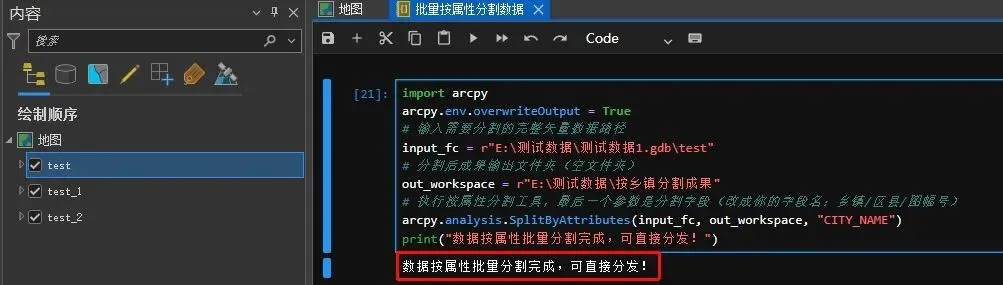 import arcpyarcpy.env.overwriteOutput = True# 输入需要分割的完整矢量数据路径input_fc = r"E:\测试数据\测试数据1.gdb\test"# 分割后成果输出文件夹(空文件夹)out_workspace = r"E:\测试数据\按乡镇分割成果"# 执行按属性分割工具,最后一个参数是分割字段(改成你的字段名:乡镇/区县/图幅号)arcpy.analysis.SplitByAttributes(input_fc, out_workspace, "CITY_NAME")