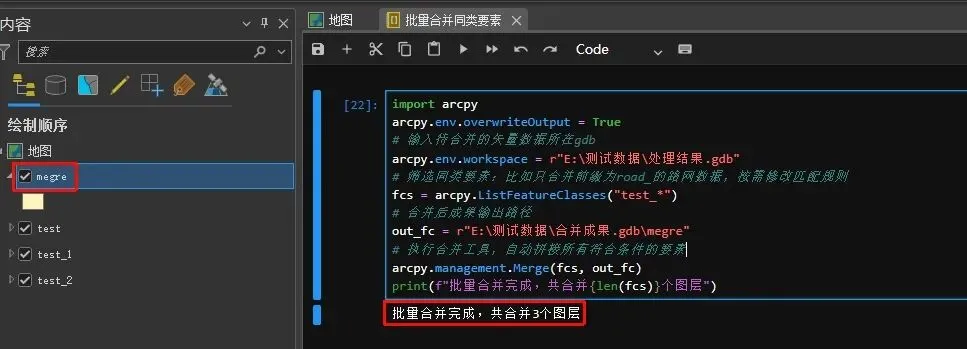 import arcpyarcpy.env.overwriteOutput = True# 输入待合并的矢量数据所在gdbarcpy.env.workspace = r"E:\测试数据\处理结果.gdb"# 筛选同类要素:比如只合并前缀为road_的路网数据,按需修改匹配规则fcs = arcpy.ListFeatureClasses("test_*")# 合并后成果输出路径out_fc = r"E:\测试数据\合并成果.gdb\megre"# 执行合并工具,自动拼接所有符合条件的要素arcpy.management.Merge(fcs, out_fc)print(f"批量合并完成,共合并{len(fcs)}个图层")