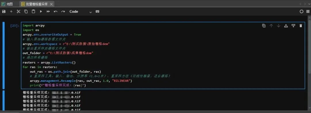 import arcpyimport osarcpy.env.overwriteOutput = True# 输入原始栅格数据文件夹arcpy.env.workspace = r"E:\测试数据\原始栅格dem"# 输出重采样后栅格文件夹out_folder = r"E:\测试数据\成果栅格dom"# 遍历所有栅格rasters = arcpy.ListRasters()for ras in rasters:out_ras = os.path.join(out_folder, ras)# 重采样工具:输入、输出、分辨率(1.0=1米)、重采样方法(双线性插值,适合栅格)arcpy.management.Resample(ras, out_ras, 1.0, "BILINEAR")print(f"栅格重采样完成:{ras}")