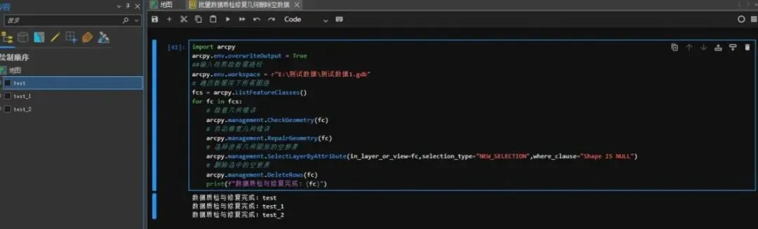 import arcpyarcpy.env.overwriteOutput = True##输入待质检数据路径arcpy.env.workspace = r"E:\测试数据\测试数据1.gdb"# 遍历数据库下所有图层fcs = arcpy.ListFeatureClasses()for fc in fcs:# 检查几何错误arcpy.management.CheckGeometry(fc)# 自动修复几何错误arcpy.management.RepairGeometry(fc)# 选择没有几何图形的空要素arcpy.management.SelectLayerByAttribute(in_layer_or_view=fc,selection_type="NEW_SELECTION",where_clause="Shape IS NULL")# 删除选中的空要素arcpy.management.DeleteRows(fc)print(f"数据质检与修复完成:{fc}")
