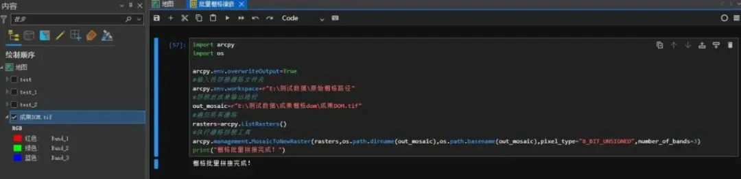 import arcpyimport osarcpy.env.overwriteOutput=True#输入待拼接栅格文件夹arcpy.env.workspace=r"E:\测试数据\原始栅格路径"#拼接后成果输出路径out_mosaic=r"E:\测试数据\成果栅格dom\成果DOM.tif"#遍历所有栅格rasters=arcpy.ListRasters()#执行栅格拼接工具arcpy.management.MosaicToNewRaster(rasters,os.path.dirname(out_mosaic),os.path.basename(out_mosaic),pixel_type="8_BIT_UNSIGNED",number_of_bands=3)print("栅格批量拼接完成!")