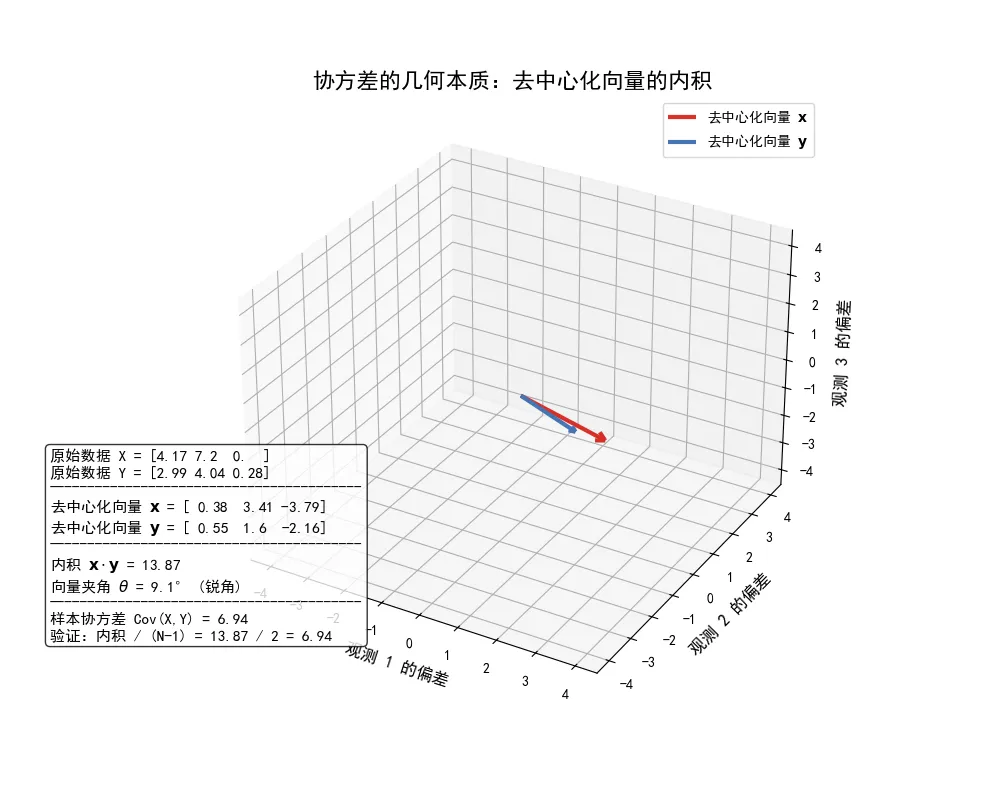 import numpy as npimport matplotlib.pyplot as pltfrom mpl_toolkits.mplot3d import Axes3Dplt.rcParams['font.sans-serif'] = ['SimHei']plt.rcParams['axes.unicode_minus'] = False# 设定随机种子np.random.seed(1)# 生成两个原始数据向量,每个向量有 3 个分量 (N=3)X = np.random.rand(3) * 10Y = 0.5 * X + np.random.rand(3) * 3# 1. 计算均值mean_X = np.mean(X)mean_Y = np.mean(Y)# 2. 计算去中心化向量 x 和 yx_centered = X - mean_Xy_centered = Y - mean_Y# 3. 计算几何量# 内积 (dot product)dot_product = np.dot(x_centered, y_centered)# 向量长度 (Euclidean norm)norm_x = np.linalg.norm(x_centered)norm_y = np.linalg.norm(y_centered)# 向量夹角的余弦值cos_theta = dot_product / (norm_x * norm_y)# 夹角(弧度转角度)theta_deg = np.rad2deg(np.arccos(cos_theta))# 4. 计算统计量# 样本协方差# 注意:np.cov 默认使用 N-1 作为分母cov_xy = np.cov(X, Y)[0, 1]# 验证关系:Cov = dot / (N-1)N = len(X)calculated_cov_from_dot = dot_product / (N - 1)# 5. 可视化fig = plt.figure(figsize=(10, 8))ax = fig.add_subplot(111, projection='3d')# 绘制去中心化向量 x 和 y# 向量起点为原点(0,0,0)ax.quiver(0, 0, 0, x_centered[0], x_centered[1], x_centered[2], color='#d73027', arrow_length_ratio=0.1, linewidth=3, label='去中心化向量 $\\mathbf{x}$')ax.quiver(0, 0, 0, y_centered[0], y_centered[1], y_centered[2], color='#4575b4', arrow_length_ratio=0.1, linewidth=3, label='去中心化向量 $\\mathbf{y}$')# 设置坐标轴范围max_val = np.max(np.abs(np.concatenate([x_centered, y_centered]))) * 1.2ax.set_xlim([-max_val, max_val])ax.set_ylim([-max_val, max_val])ax.set_zlim([-max_val, max_val])ax.set_xlabel('观测 1 的偏差', fontsize=12)ax.set_ylabel('观测 2 的偏差', fontsize=12)ax.set_zlabel('观测 3 的偏差', fontsize=12)ax.set_title('协方差的几何本质:去中心化向量的内积', fontsize=16)# 添加文本信息info_text = (f"原始数据 X = {np.round(X, 2)}\n"f"原始数据 Y = {np.round(Y, 2)}\n"f"-----------------------------------------\n"f"去中心化向量 $\\mathbf{{x}}$ = {np.round(x_centered, 2)}\n"f"去中心化向量 $\\mathbf{{y}}$ = {np.round(y_centered, 2)}\n"f"-----------------------------------------\n"f"内积 $\\mathbf{{x}} \\cdot \\mathbf{{y}}$ = {dot_product:.2f}\n"f"向量夹角 $\\theta$ = {theta_deg:.1f}° (锐角)\n"f"-----------------------------------------\n"f"样本协方差 Cov(X,Y) = {cov_xy:.2f}\n"f"验证:内积 / (N-1) = {dot_product:.2f} / 2 = {calculated_cov_from_dot:.2f}")# 使用 figtext 在画布的固定位置添加文本框plt.figtext(0.05, 0.2, info_text, fontsize=11, bbox=dict(boxstyle='round', facecolor='white', alpha=0.8))ax.legend()plt.show()执行结果如下: