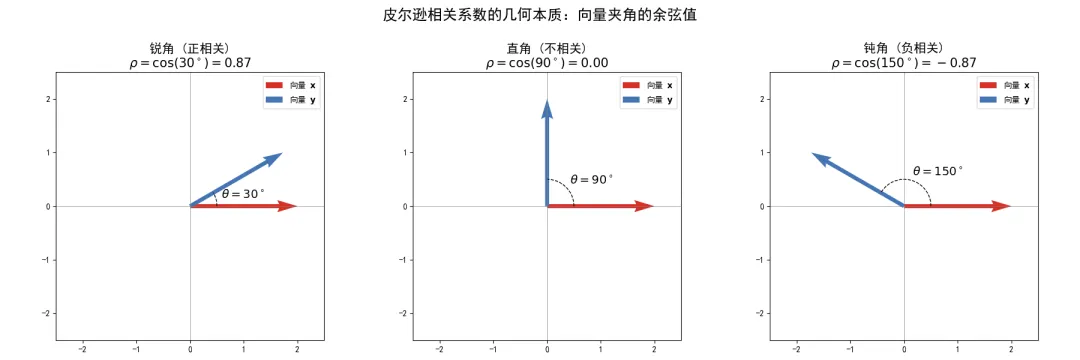 import numpy as npimport matplotlib.pyplot as pltplt.rcParams['font.sans-serif'] = ['SimHei']plt.rcParams['axes.unicode_minus'] = False# 为了便于在 2D 平面可视化,我们假设 N=2# 定义一个固定的去中心化向量 xx_centered = np.array([2.0, 0.0])# 创建一个 1x3 的子图布局fig, axes = plt.subplots(1, 3, figsize=(18, 6))fig.suptitle('皮尔逊相关系数的几何本质:向量夹角的余弦值', fontsize=18)# 场景1:锐角(正相关)theta1 = np.deg2rad(30) # 30度角rotation_matrix1 = np.array([[np.cos(theta1), -np.sin(theta1)], [np.sin(theta1), np.cos(theta1)]])y_centered1 = np.dot(rotation_matrix1, x_centered)corr1 = np.dot(x_centered, y_centered1) / (np.linalg.norm(x_centered) * np.linalg.norm(y_centered1))# 场景2:直角(不相关)theta2 = np.deg2rad(90) # 90度角rotation_matrix2 = np.array([[np.cos(theta2), -np.sin(theta2)], [np.sin(theta2), np.cos(theta2)]])y_centered2 = np.dot(rotation_matrix2, x_centered)corr2 = np.dot(x_centered, y_centered2) / (np.linalg.norm(x_centered) * np.linalg.norm(y_centered2))# 场景3:钝角(负相关)theta3 = np.deg2rad(150) # 150度角rotation_matrix3 = np.array([[np.cos(theta3), -np.sin(theta3)], [np.sin(theta3), np.cos(theta3)]])y_centered3 = np.dot(rotation_matrix3, x_centered)corr3 = np.dot(x_centered, y_centered3) / (np.linalg.norm(x_centered) * np.linalg.norm(y_centered3))scenarios = [ (axes[0], y_centered1, theta1, corr1, '锐角 (正相关)'), (axes[1], y_centered2, theta2, corr2, '直角 (不相关)'), (axes[2], y_centered3, theta3, corr3, '钝角 (负相关)')]for ax, y_vec, angle_rad, corr, title in scenarios:# 绘制向量 x ax.quiver(0, 0, x_centered[0], x_centered[1], angles='xy', scale_units='xy', scale=1, color='#d73027', width=0.015, label='向量 $\\mathbf{x}$')# 绘制向量 y ax.quiver(0, 0, y_vec[0], y_vec[1], angles='xy', scale_units='xy', scale=1, color='#4575b4', width=0.015, label='向量 $\\mathbf{y}$')# 绘制夹角弧线 angle_deg = np.rad2deg(angle_rad) arc = plt.matplotlib.patches.Arc((0, 0), 1.0, 1.0, angle=0, theta1=0, theta2=angle_deg, color='black', linestyle='--') ax.add_patch(arc) ax.text(0.6 * np.cos(angle_rad / 2), 0.6 * np.sin(angle_rad / 2), f'$\\theta={angle_deg:.0f}^\\circ$', fontsize=14)# 设置坐标轴 ax.set_xlim(-2.5, 2.5) ax.set_ylim(-2.5, 2.5) ax.set_aspect('equal') ax.axhline(0, color='grey', lw=0.5) ax.axvline(0, color='grey', lw=0.5) ax.set_title(f'{title}\n$\\rho = \\cos({angle_deg:.0f}^\\circ) = {corr:.2f}$', fontsize=15) ax.legend(loc='upper right')plt.tight_layout(rect=[0, 0.03, 1, 0.93])plt.show()执行结果如下: