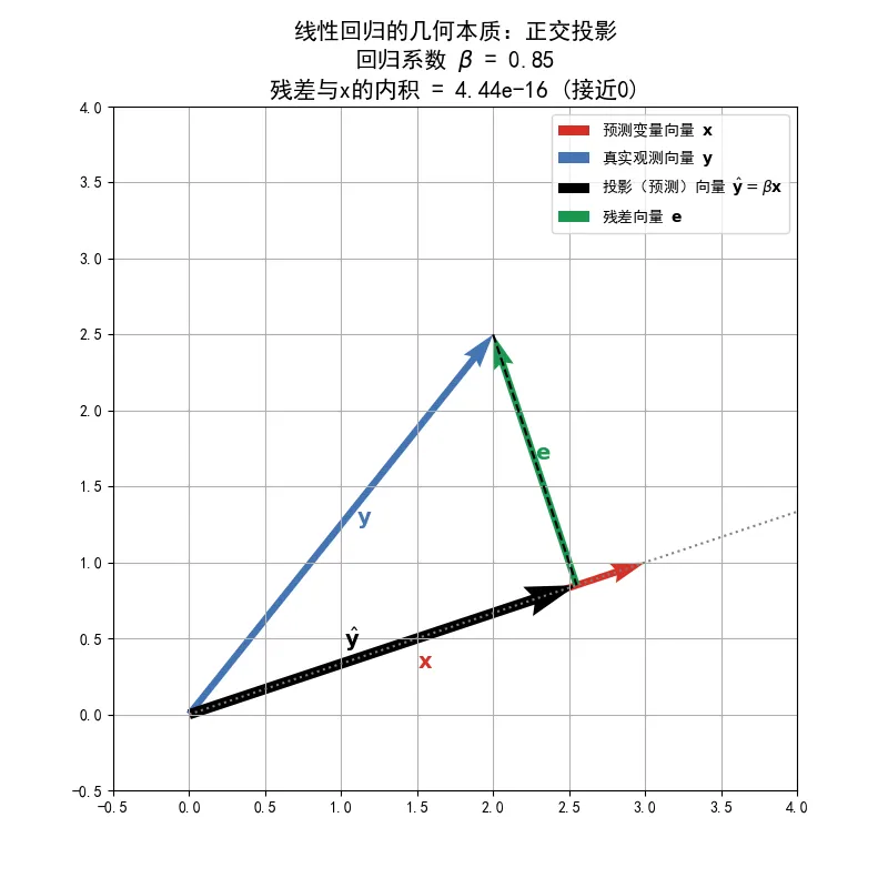 import numpy as npimport matplotlib.pyplot as pltplt.rcParams['font.sans-serif'] = ['SimHei']plt.rcParams['axes.unicode_minus'] = False# 再次假设 N=2 以便在 2D 平面可视化# 定义两个去中心化向量x_centered = np.array([3.0, 1.0])y_centered = np.array([2.0, 2.5])# 计算几何量dot_product = np.dot(y_centered, x_centered)norm_x_sq = np.dot(x_centered, x_centered)beta_hat = dot_product / norm_x_sq# 计算投影向量y_hat = beta_hat * x_centered# 计算残差向量residual = y_centered - y_hat# 创建图表fig, ax = plt.subplots(figsize=(8, 8))# 绘制向量ax.quiver(0, 0, x_centered[0], x_centered[1], angles='xy', scale_units='xy', scale=1, color='#d73027', width=0.01, label='预测变量向量 $\\mathbf{x}$')ax.quiver(0, 0, y_centered[0], y_centered[1], angles='xy', scale_units='xy', scale=1, color='#4575b4', width=0.01, label='真实观测向量 $\\mathbf{y}$')ax.quiver(0, 0, y_hat[0], y_hat[1], angles='xy', scale_units='xy', scale=1, color='black', width=0.015, label='投影(预测)向量 $\\hat{\\mathbf{y}} = \\beta \\mathbf{x}$')ax.quiver(y_hat[0], y_hat[1], residual[0], residual[1], angles='xy', scale_units='xy', scale=1, color='#1a9850', width=0.01, label='残差向量 $\\mathbf{e}$')# 绘制辅助线ax.plot([y_centered[0], y_hat[0]], [y_centered[1], y_hat[1]], 'k--')ax.plot([0, x_centered[0]*1.5], [0, x_centered[1]*1.5], 'gray', linestyle=':')# 添加文本和标签ax.text(x_centered[0]*0.5, x_centered[1]*0.5-0.2, '$\\mathbf{x}$', fontsize=14, color='#d73027')ax.text(y_centered[0]*0.5+0.1, y_centered[1]*0.5, '$\\mathbf{y}$', fontsize=14, color='#4575b4')ax.text(y_hat[0]*0.4, y_hat[1]*0.4+0.1, '$\\hat{\\mathbf{y}}$', fontsize=14, color='black')ax.text(y_hat[0] + residual[0]*0.5, y_hat[1] + residual[1]*0.5, '$\\mathbf{e}$', fontsize=14, color='#1a9850')# 验证正交性residual_dot_x = np.dot(residual, x_centered)ax.set_title(f'线性回归的几何本质:正交投影\n回归系数 $\\beta$ = {beta_hat:.2f}\n残差与x的内积 = {residual_dot_x:.2e} (接近0)', fontsize=15)ax.set_xlim(-0.5, 4)ax.set_ylim(-0.5, 4)ax.set_aspect('equal')ax.grid(True)ax.legend()plt.show()执行结果如下: