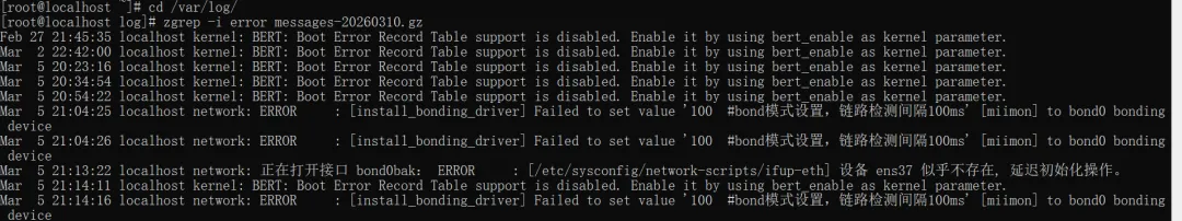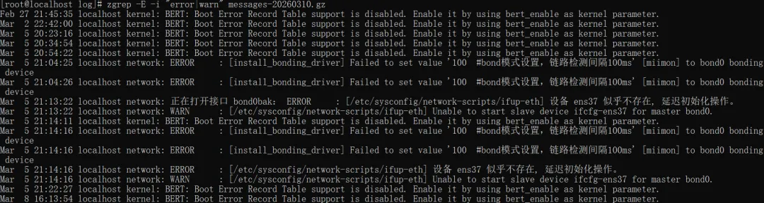 #同时检索error、warn两种关键信息zgrep -E -i "error|warn" messages-20260310.gz