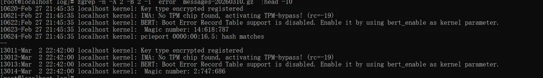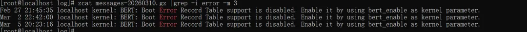 #只显示前3条error日志 zcat messages-20260310.gz |grep -i error -m 3