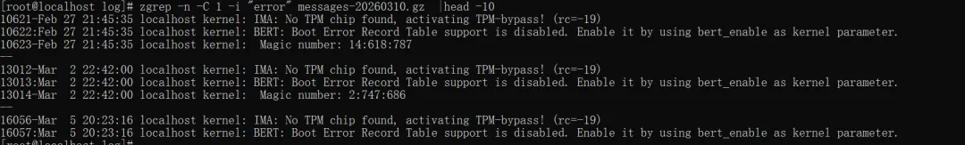 #显示前后1行,并带行号 zgrep -n -C 1 -i "error" messages-20260310.gz