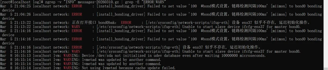 #排除INFO日志,只看ERROR和WARNzgrep -v "INFO" messages-20260310.gz | grep -E "ERROR|WARN"