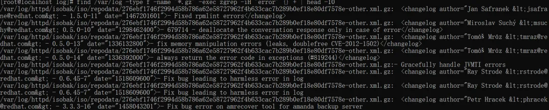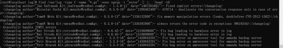 #通过find替代,或者征集zgrepfind /var/log -type f -name "*.gz" -exec zgrep -i "error" {} \; |head -10