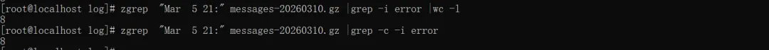 #统计3月5日21点-22点之间的error错误次数,以下两种都可以zgrep "Mar 5 21:" messages-20260310.gz |grep -i error |wc -lzgrep "Mar 5 21:" messages-20260310.gz |grep -c -i error