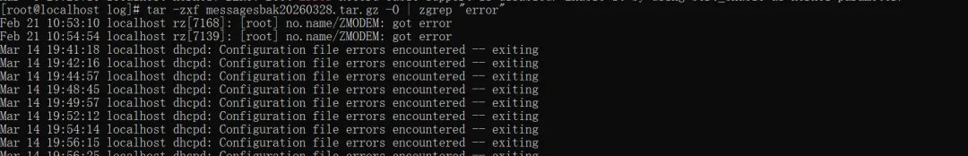tar -zxf messagesbak20260328.tar.gz -O | zgrep "error"