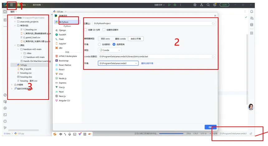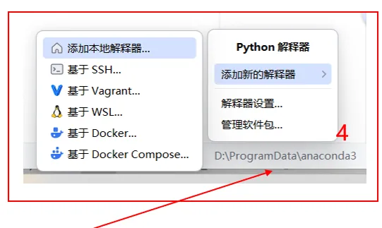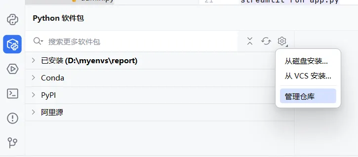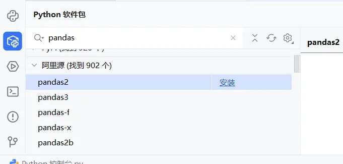 2,位置:选择后续软件开发的目录/自定义环境/选择现有/conda/路径输入D:\ProgramData\anaconda3\Library\bin\conda.bat/重新加载环境/下拉键选择想要的环境即可(如果此处报红,则路径调整为D:\ProgramData\anaconda3\Scripts\conda.exe,该现象为pycharm与conda不同版本兼容出现的问题),完成创建;3,在设计目录下,右键/新建python文件,即可在右侧代码编辑区域进行代码编辑调试工作了;4,如果要调整环境运行,或者切换环境运行,点击右下角/添加新的解释器/添加本地解释器/后续与2操作相同;在左下角的软件包模块,进入库的下载,输入库的名称后,默认从pypi下载库,但是采用的是国外的源非常慢,经常安装失败,所以第一步,先把阿里源加上点击齿轮/管理仓库/添加阿里源https://mirrors.aliyun.com/pypi/simple/搜索的库,比如pandas,通过阿里源安装就会很快