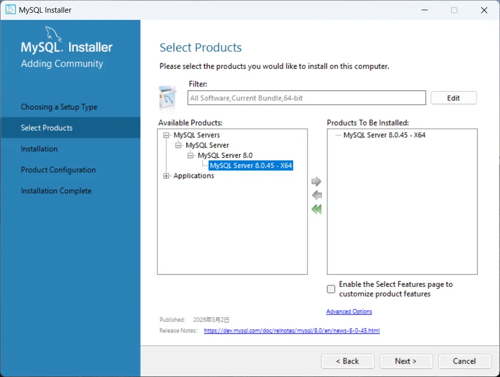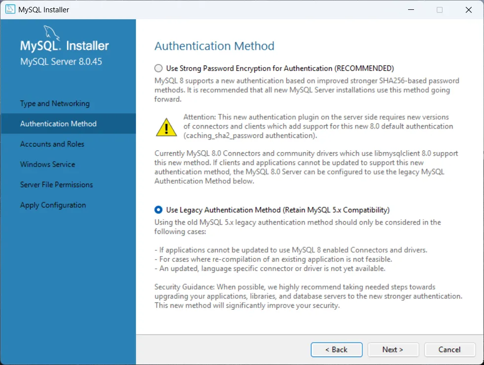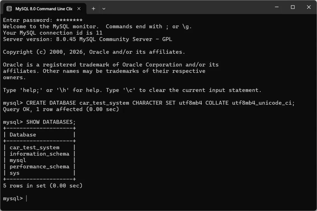 官网https://dev.mysql.com/downloads/installer/,下载Windows版本MSI安装包(32位安装包包含64位程序)1,选择“custom”/选中MySQL server 8.0.45/点击右下角的advanced options,将安装目录调整为E盘,next/点击execute,完成服务安装2,配置mysql,默认next/认证方式,选择 Use Legacy Authentication Method(兼容性更好)next/输入root密码“这个密码很重要是进入数据库的钥匙,请牢记!”next/然后一直下一步或者安装就结束了,其它设置全部默认,需要修改的部分,见下面两张图的界面。设置root账号密码,务必牢记,后续连接数据库需要安装完成后,开始菜单找到MySQL 8.0 Command Line Client,输入密码,能正常进入即为安装成功。后续根据程序需要,可以创建多个用户,每个用户都可以和Python链接,分区存储,比如性能/耐久/评价/其它等等,各个库互不影响,可设置单独的密码,这个很实用。