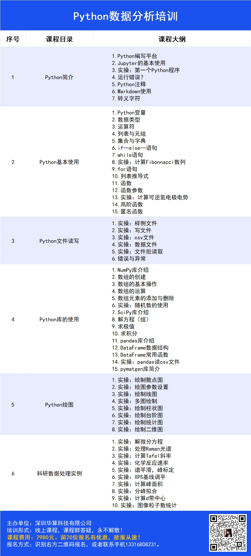 小到数据的单位转换,大到数据的批量处理,这些常用的数据处理过程都是研究中不可缺少的内容。随着实验方法与仪器技术的快速发展,化学与材料学研究中可获取的数据越来越多,对应的数据后处理过程也愈发重要。简单的数据分析过程可通过手动处理完成,而大量的、复杂的数据处理过程则依赖于各式科研软件与程序设计。Python,编程语言的新王者,目前正以不可阻挡的势头应用到各个领域。现在,已经很难找到一个没有应用Python的领域了。在科研领域,无论是实验科学还是计算科学,Python都有着广泛的应用。数据后处理,脚本编写,科研绘图,机器学习,这些都是Python使用的重要领域。然而,由于化学与材料学常规学习中缺乏编程相关课程,同学们常会对编程、代码产生畏惧。网络上各式的Python教程则由于案例设计与我们的真实研究相距较远,易导致学习过程枯燥,完成学习后不会应用等情况,从入门到放弃屡屡发生。针对这个普遍存在的问题,华算科技推出《Python数据分析》课程。课程针对编程零基础学员,并包含实验与计算中常见的科研数据处理案例。同学们学习完成后可直接将Python应用于自己的研究数据后处理之中,适合有数据分析需求的实验课题组/计算课题组同学。Python课程与机器学习课程同时报名可优惠更多,详情可扫码咨询课程客服。👇👇扫描二维码,立即报名👇👇