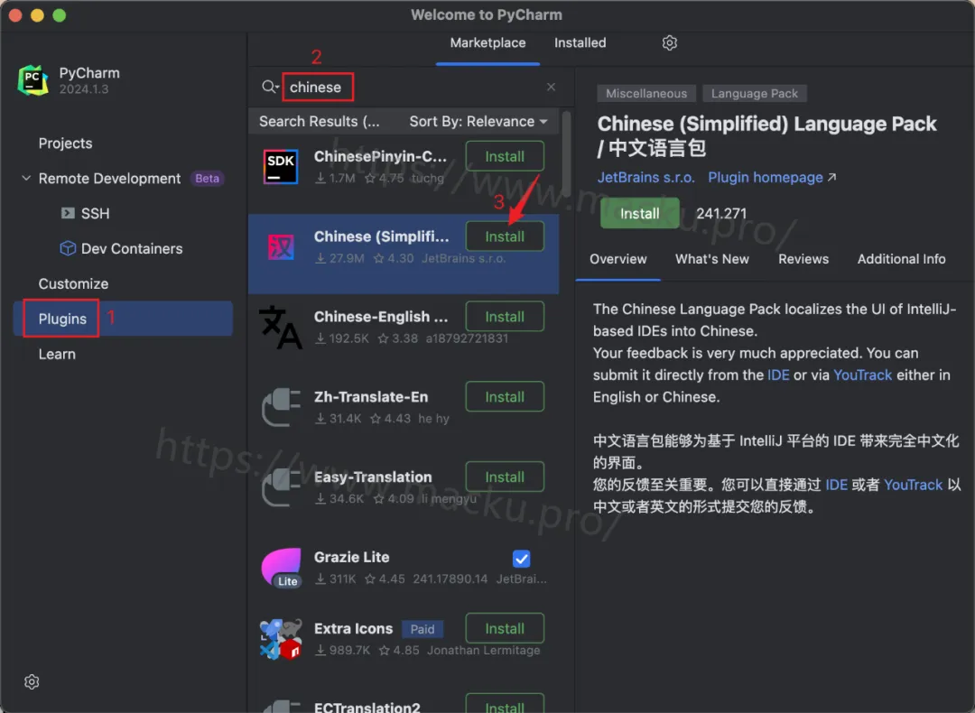 安装完成后单击左边的【Plugins】,在搜索框中输入【Chinese】,找到【Chinese(Simplified) Language】然后单击【Install】