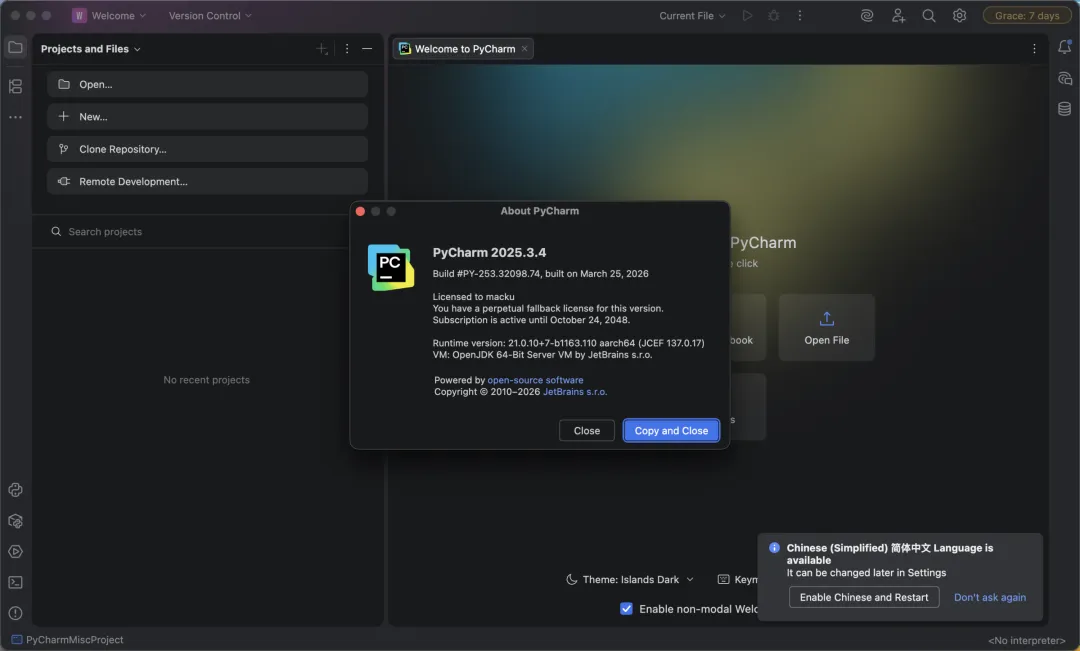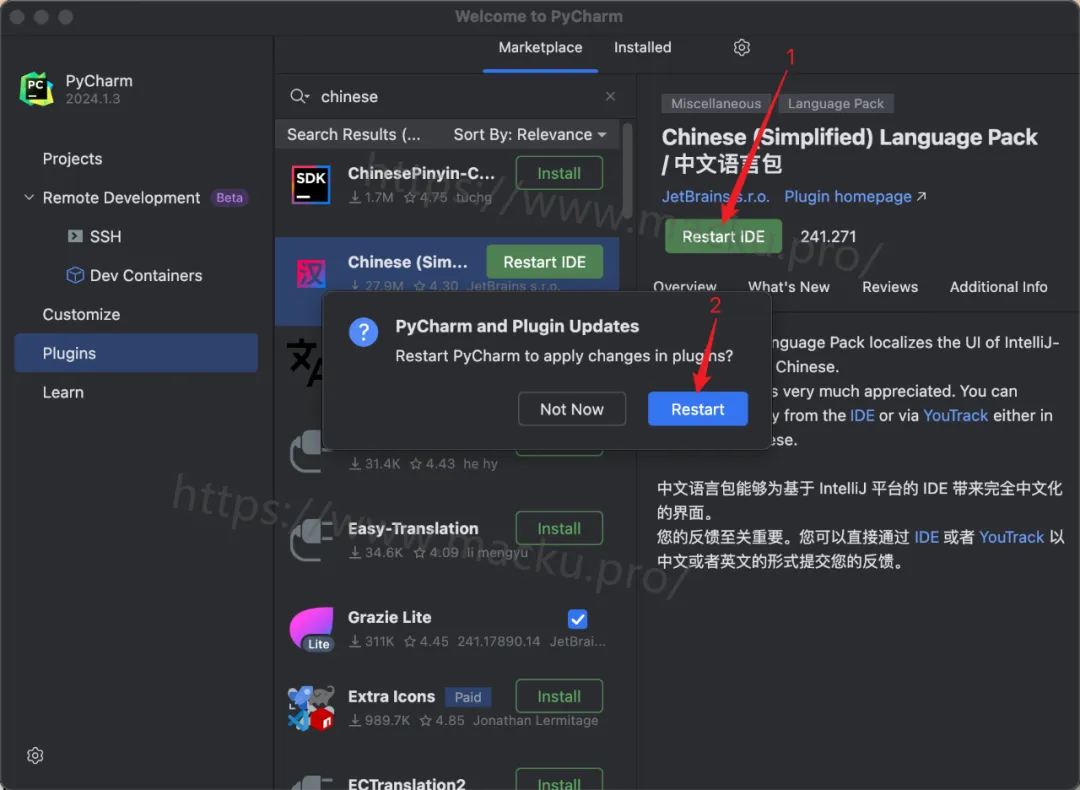 汉化补丁安装完成后会显示如下界面,然后依次单击【Restart IDE】—【Restart】重启IDE,等待软件重启完成即可如果无法在线切换中文简体语言: