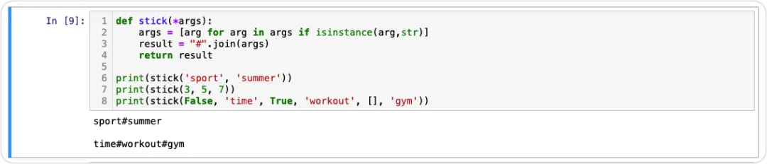 实现一个名为stick()的函数,该函数接受任意数量的位置参数,并返回一个str类型的对象,该对象是将所有str类型的参数用#号连接起来的结果(见下文)。[IN]: stick('sport', 'summer', 4, True)[OUT]: 'sport#summer'