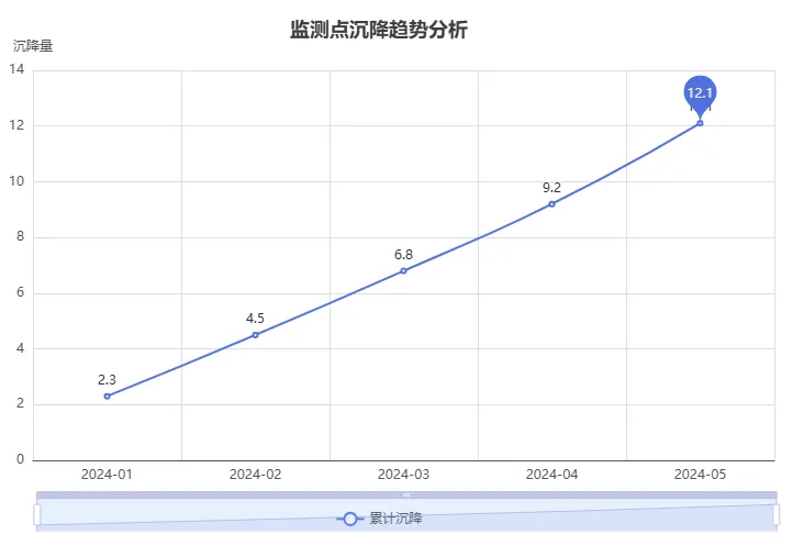from pyecharts.charts import Linefrom pyecharts import options as opts# 假设有监测数据:日期和累计沉降量dates = ['2024-01', '2024-02', '2024-03', '2024-04', '2024-05']settlement_data = [2.3, 4.5, 6.8, 9.2, 12.1]# 创建动态折线图line = Line(init_opts=opts.InitOpts(width="900px", height="500px"))line.add_xaxis(dates)line.add_yaxis(series_name="累计沉降",y_axis=settlement_data,is_smooth=True,markpoint_opts=opts.MarkPointOpts(data=[opts.MarkPointItem(type_="max", name="最大值")]))line.set_global_opts(title_opts=opts.TitleOpts(title="监测点沉降趋势分析"),yaxis_opts=opts.AxisOpts(name="沉降量"),datazoom_opts=opts.DataZoomOpts(is_show=True),tooltip_opts=opts.TooltipOpts(trigger="axis"))line.render('变形监测_趋势图.html')print("图表已生成!打开HTML文件查看动态效果")