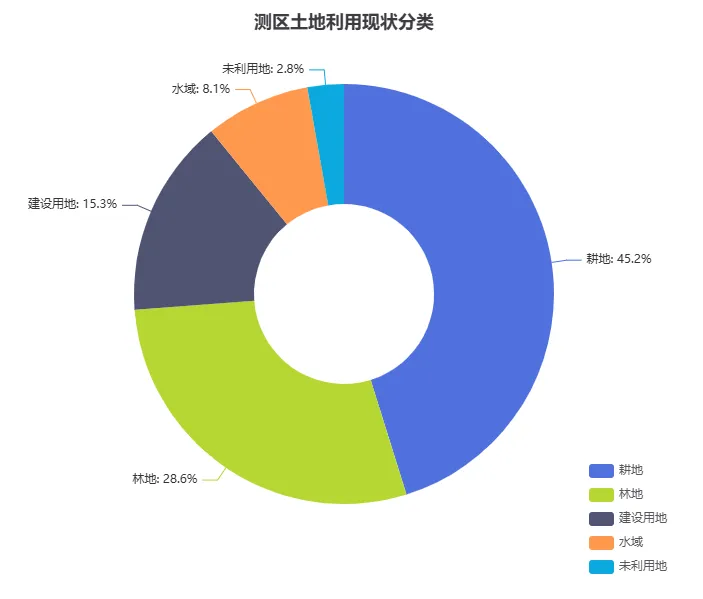 from pyecharts.charts import Piefrom pyecharts import options as opts# 假设宗地分类数据land_types = ['耕地', '林地', '建设用地', '水域', '未利用地']areas = [45.2, 28.6, 15.3, 8.1, 2.8]pie = Pie(init_opts=opts.InitOpts(width="800px", height="600px"))pie.add( series_name="土地类型", data_pair=[(t, a) for t, a in zip(land_types, areas)], radius=["30%", "70%"], # 环形图,更现代 label_opts=opts.LabelOpts(formatter="{b}: {d}%"))pie.set_global_opts( title_opts=opts.TitleOpts(title="测区土地利用现状分类"), legend_opts=opts.LegendOpts(orient="vertical", pos_left="80%"))pie.render('土地利用_分类图.html')