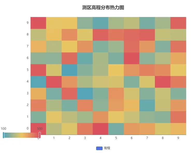 from pyecharts.charts import HeatMapfrom pyecharts import options as optsimport random# 模拟高程网格数据(实际应用中读取DEM数据)x_range = [str(i) for i in range(10)]y_range = [str(i) for i in range(10)]data = [[i, j, random.randint(100, 500)] for i in range(10) for j in range(10)]heatmap = HeatMap(init_opts=opts.InitOpts(width="800px", height="600px"))heatmap.add_xaxis(x_range)heatmap.add_yaxis("高程", y_range, data, label_opts=opts.LabelOpts(is_show=False))heatmap.set_global_opts( title_opts=opts.TitleOpts(title="测区高程分布热力图"), visualmap_opts=opts.VisualMapOpts( min_=100, max_=500, orient="horizontal", pos_bottom="10%" ))heatmap.render('高程分布_热力图.html')