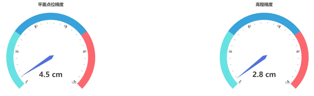 from pyecharts.charts import Gauge, Pagefrom pyecharts import options as optspage = Page(layout=Page.SimplePageLayout)# 点位精度仪表盘gauge1 = Gauge()gauge1.add("点位中误差", [("", 4.5)], # 假设精度4.5cm split_number=5, axisline_opts=opts.AxisLineOpts( linestyle_opts=opts.LineStyleOpts( color=[(0.3, "#67e0e3"), (0.7, "#37a2da"), (1, "#fd666d")], width=30 ) ), detail_label_opts=opts.LabelOpts(formatter="{value} cm"))gauge1.set_global_opts( title_opts=opts.TitleOpts(title="平面点位精度", pos_left="center"), legend_opts=opts.LegendOpts(is_show=False))# 高程精度仪表盘gauge2 = Gauge()gauge2.add("高程中误差", [("", 2.8)], split_number=5, axisline_opts=opts.AxisLineOpts( linestyle_opts=opts.LineStyleOpts( color=[(0.3, "#67e0e3"), (0.7, "#37a2da"), (1, "#fd666d")], width=30 ) ), detail_label_opts=opts.LabelOpts(formatter="{value} cm"))gauge2.set_global_opts( title_opts=opts.TitleOpts(title="高程精度", pos_left="center"), legend_opts=opts.LegendOpts(is_show=False))page.add(gauge1, gauge2)page.render('质量检查_仪表盘.html')