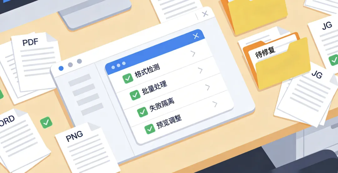 断点续传+错误隔离:批量处理时,把失败的文件单独放入“处理失败”文件夹,并在日志里记录失败原因,其他文件继续处理。不要让一颗老鼠屎坏了一锅粥。