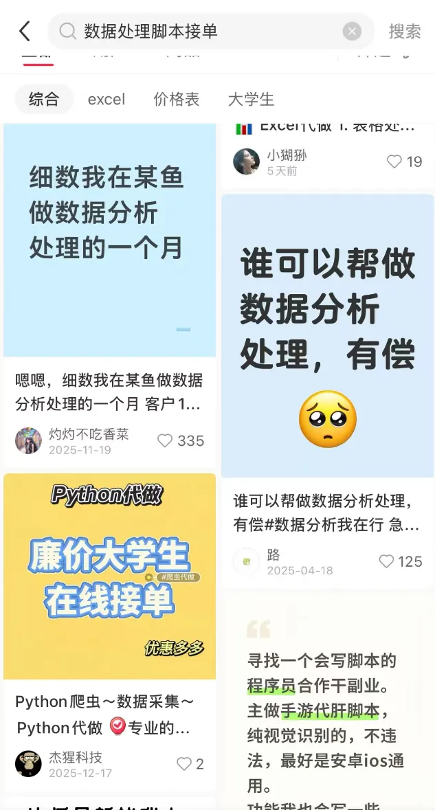 在闲鱼上挂“Excel自动化”“数据处理脚本定制”,在小红书上写一些相关图文、价格标低一点(比如50元起),积累案例和好评。很多人通过这种方式接到了第一个订单。