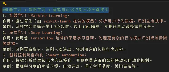 说明:具体表现为通过使用机器学习工具(如scikit-learn和TensorFlow),可以让智能家居系统学会你的生活规律,比如你每天什么时候起床、睡觉或回家,然后自动帮你打开或关闭灯光、调节空调,让家里更舒适又省心。