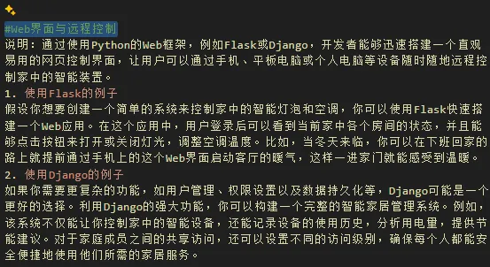 说明:用Flask、Django等Python Web框架,可以快速搭建网页控制界面,让用户通过手机或电脑远程控制家居设备。