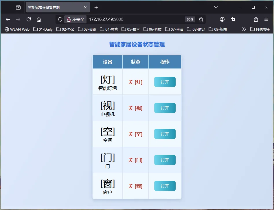 为了帮助读者更好地理解实践过程,文中提供了具体的Python代码示例,展示了如何使用Flask框架搭建一个Web界面。这个界面能够实现对多种虚拟家居设备(如智能灯泡、电视机、空调、门窗等)的远程控制。这种做法不仅使得智能家居的控制更加直观方便,也为读者提供了一个直观的操作平台。