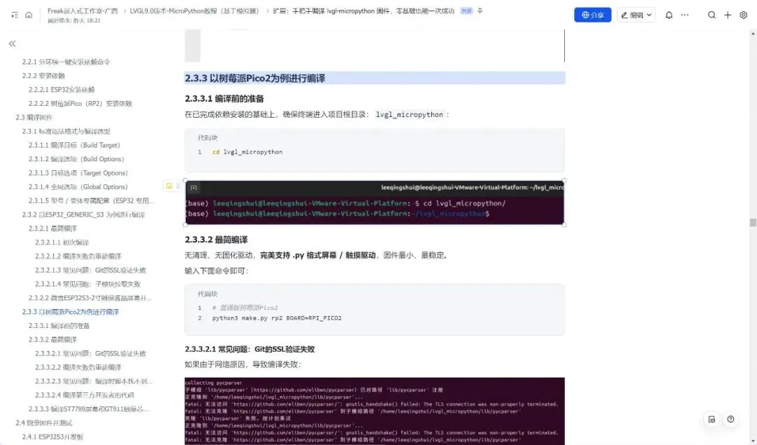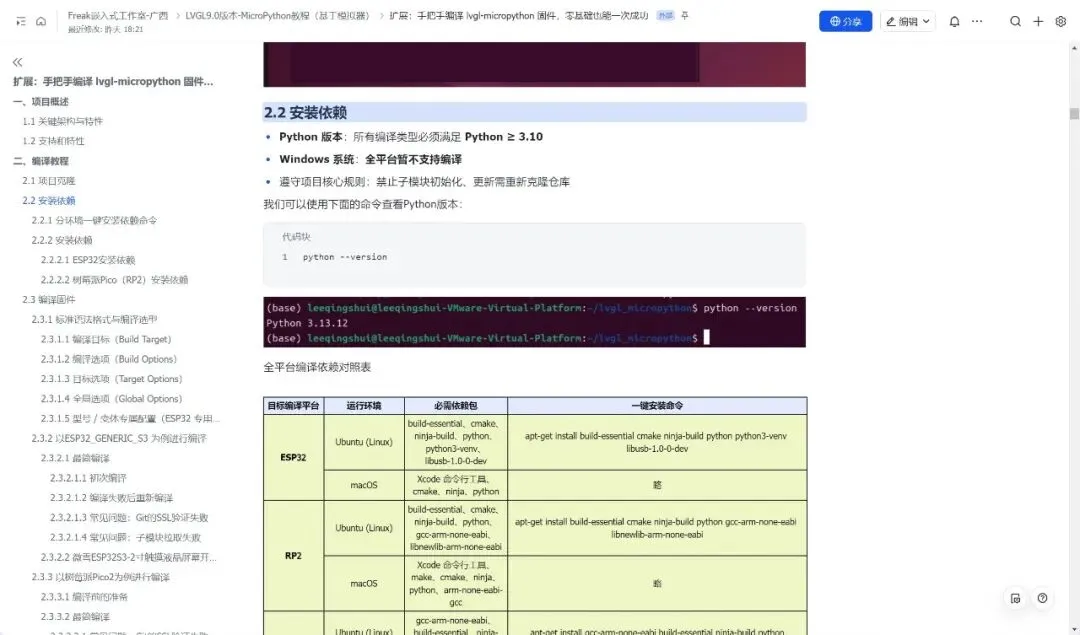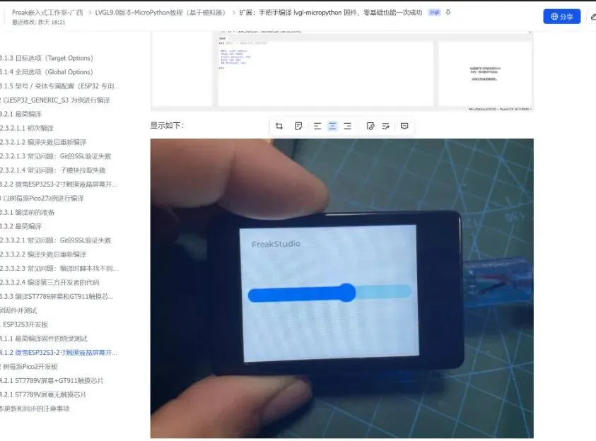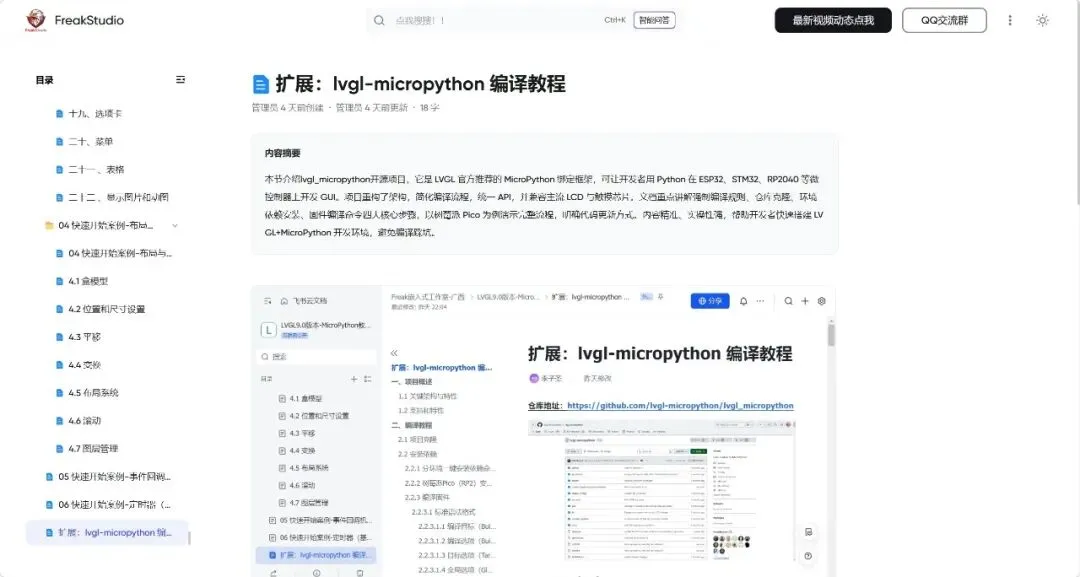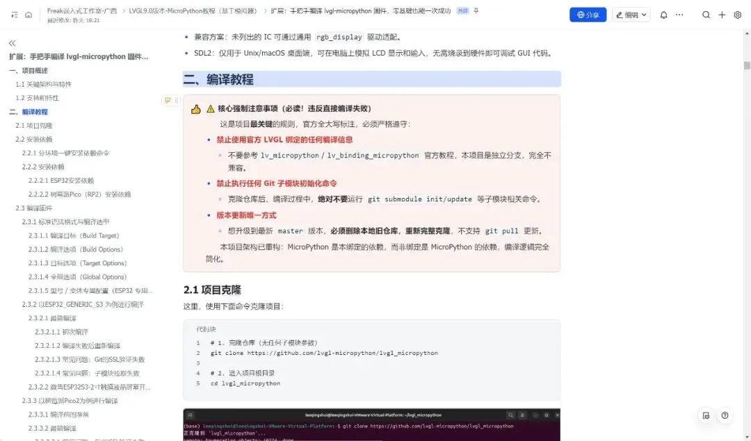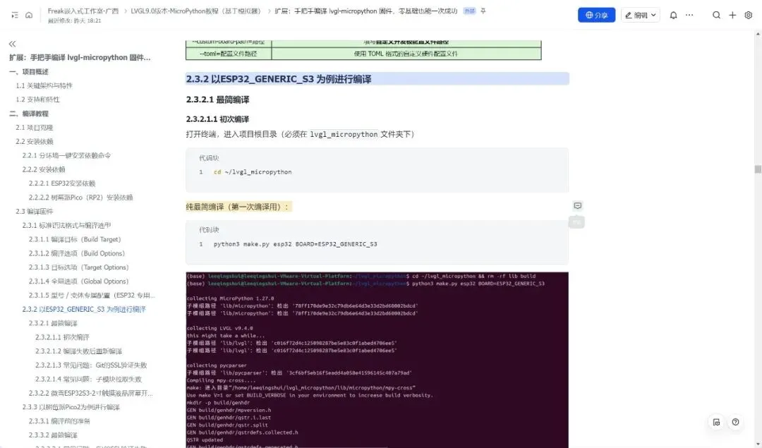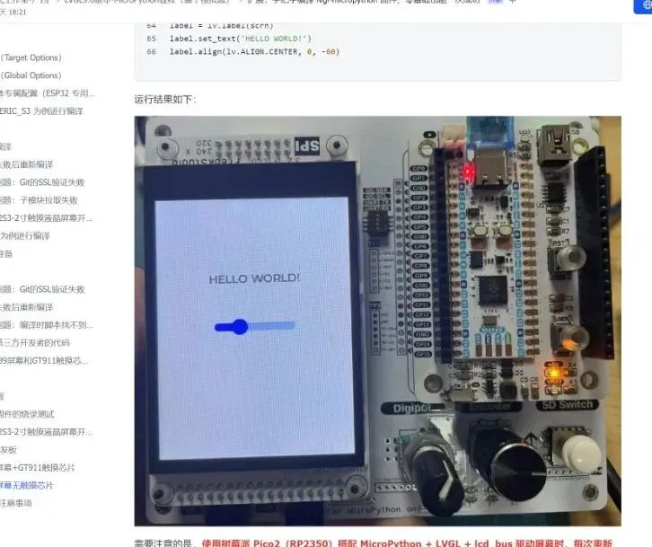 整篇教程遵循 “准备 → 实战 → 验证” 的逻辑展开:先介绍项目架构与依赖要求,再手把手教你安装编译环境、克隆项目、执行编译命令,最后演示如何烧录固件并在开发板上运行 GUI 代码。读完这篇教程,你不仅能掌握 lvgl-micropython 的编译方法,还能理解嵌入式 GUI 固件的编译原理,学会根据自己的硬件(屏幕、触摸芯片、开发板型号)自定义配置,快速搭建属于自己的 Python 嵌入式 GUI 开发环境。