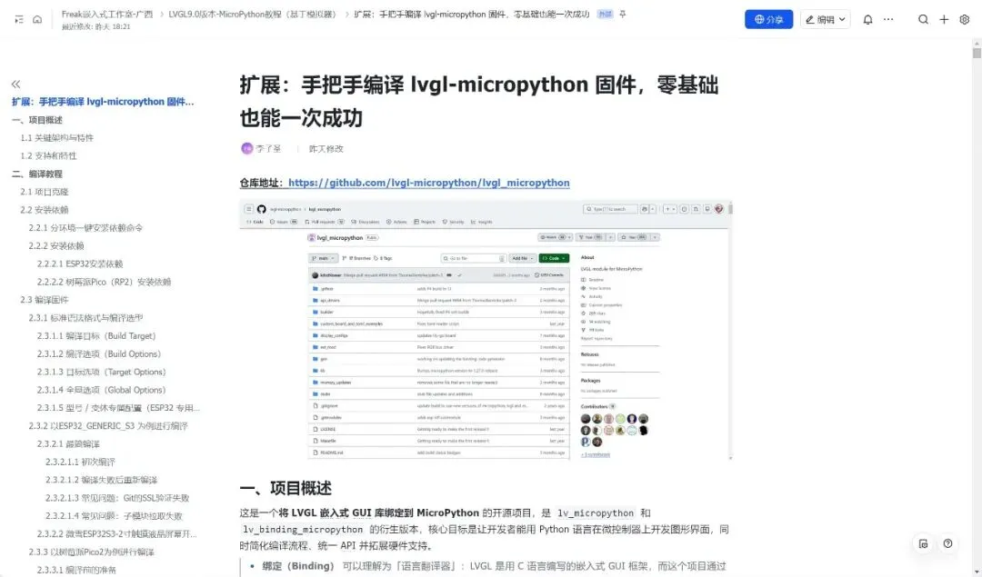 嵌入式 GUI 开发向来是门槛较高的领域 ——LVGL 作为轻量高效的开源 GUI 框架,却需要 C 语言开发;而 MicroPython 让 Python 能跑在微控制器上,却缺乏成熟的图形界面方案。lvgl-micropython 项目正是为了打破这一壁垒:它将 LVGL 与 MicroPython 深度绑定,让开发者能用 Python 语言在 ESP32、树莓派 Pico 等微控制器上快速开发图形界面,同时把复杂的编译流程简化到 “一条命令搞定”,让零基础开发者也能轻松编译出专属固件。