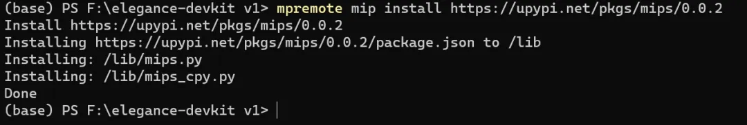 看到终端输出 Done,就说明安装成功了 ——mips.py 和 mips_cpy.py 会自动传到 ESP32 的 /lib 目录。