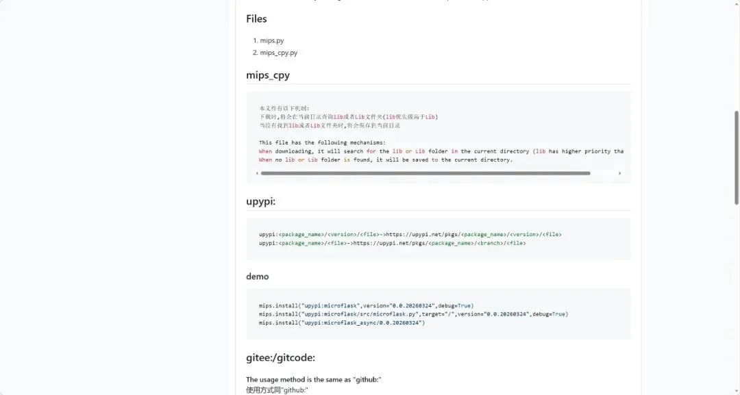 upypi:microflask → 自动映射到 https://upypi.net/pkgs/microflask/gitee:wth_iw0/microflaskgitcode:wth_iw0/microdns → 支持 gitcode,还加了 sleep(2) 反爬机制