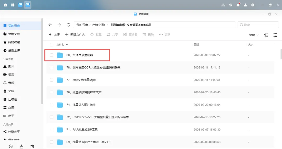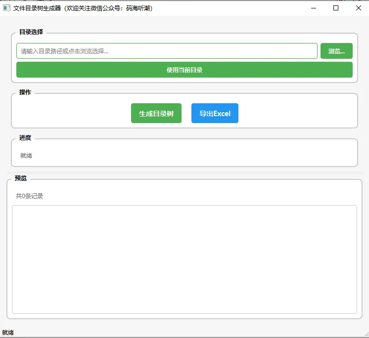 import sysfrom PyQt6.QtWidgets import ( QApplication, QMainWindow, QWidget, QVBoxLayout, QHBoxLayout, QPushButton, QLineEdit, QLabel, QFileDialog, QTableWidget, QTableWidgetItem, QProgressBar, QGroupBox, QSplitter, QHeaderView)from PyQt6.QtCore import Qt, QSizefrom PyQt6.QtGui import QFontclass MainWindow(QMainWindow): """主窗口""" def __init__(self): super().__init__() self.setWindowTitle("文件目录树生成器(欢迎关注微信公众号:码海听潮)") self.setMinimumSize(750, 650) # 设置窗口样式 self.setStyleSheet(""" QMainWindow { background-color: #f5f5f5; } QGroupBox { font-weight: bold; border: 2px solid #cccccc; border-radius: 8px; margin-top: 10px; padding-top: 10px; background-color: white; } QGroupBox::title { subcontrol-origin: margin; left: 10px; padding: 0 5px 0 5px; } QPushButton { background-color: #4CAF50; border: none; color: white; padding: 8px 16px; border-radius: 4px; font-weight: bold; } QPushButton:hover { background-color: #45a049; } QPushButton:pressed { background-color: #3d8b40; } QPushButton:disabled { background-color: #cccccc; } QLineEdit { padding: 6px; border: 1px solid #cccccc; border-radius: 4px; font-size: 12px; } QLineEdit:focus { border-color: #4CAF50; } QTableWidget { border: 1px solid #cccccc; border-radius: 4px; background-color: white; gridline-color: #e0e0e0; } QTableWidget::item { padding: 4px; } QHeaderView::section { background-color: #f0f0f0; padding: 4px; border: 1px solid #cccccc; font-weight: bold; } QProgressBar { border: 1px solid #cccccc; border-radius: 4px; text-align: center; background-color: white; } QProgressBar::chunk { background-color: #4CAF50; border-radius: 3px; } """) # 创建中心部件 central_widget = QWidget() self.setCentralWidget(central_widget) # 主布局 main_layout = QVBoxLayout(central_widget) main_layout.setSpacing(10) main_layout.setContentsMargins(15, 15, 15, 15) # 创建分割器 splitter = QSplitter(Qt.Orientation.Vertical) # 上半部分:控制区域 control_widget = QWidget() control_layout = QVBoxLayout(control_widget) control_layout.setSpacing(10) # 路径选择组 path_group = QGroupBox("目录选择") path_layout = QVBoxLayout(path_group) # 路径输入行 path_input_layout = QHBoxLayout() self.path_input = QLineEdit() self.path_input.setPlaceholderText("请输入目录路径或点击浏览选择...") self.browse_btn = QPushButton("浏览...") path_input_layout.addWidget(self.path_input) path_input_layout.addWidget(self.browse_btn) # 使用当前目录按钮 self.use_current_btn = QPushButton("使用当前目录") path_layout.addLayout(path_input_layout) path_layout.addWidget(self.use_current_btn) control_layout.addWidget(path_group) # 操作按钮组 button_group = QGroupBox("操作") button_layout = QHBoxLayout(button_group) self.generate_btn = QPushButton("生成目录树") self.generate_btn.setMinimumHeight(40) self.generate_btn.setStyleSheet("font-size: 14px;") self.export_btn = QPushButton("导出Excel") self.export_btn.setMinimumHeight(40) self.export_btn.setStyleSheet("font-size: 14px; background-color: #2196F3;") self.export_btn.setEnabled(False) # 创建水平布局用于居中显示按钮 button_widget_layout = QHBoxLayout() button_widget_layout.addStretch() button_widget_layout.addWidget(self.generate_btn) button_widget_layout.addWidget(self.export_btn) button_widget_layout.addStretch() button_widget_layout.setSpacing(20) button_layout.addLayout(button_widget_layout) control_layout.addWidget(button_group) # 进度显示组 progress_group = QGroupBox("进度") progress_layout = QVBoxLayout(progress_group) self.progress_bar = QProgressBar() self.progress_bar.setVisible(False) self.status_label = QLabel("就绪") self.status_label.setStyleSheet("color: #666; padding: 5px;") progress_layout.addWidget(self.progress_bar) progress_layout.addWidget(self.status_label) control_layout.addWidget(progress_group) splitter.addWidget(control_widget) # 下半部分:预览区域 preview_group = QGroupBox("预览") preview_layout = QVBoxLayout(preview_group) # 添加预览信息标签 preview_info_layout = QHBoxLayout() self.preview_count_label = QLabel("共0条记录") self.preview_count_label.setStyleSheet("color: #666; padding: 5px;") preview_info_layout.addWidget(self.preview_count_label) preview_info_layout.addStretch() self.preview_table = QTableWidget() self.preview_table.setAlternatingRowColors(True) self.preview_table.horizontalHeader().setStretchLastSection(True) preview_layout.addLayout(preview_info_layout) preview_layout.addWidget(self.preview_table) splitter.addWidget(preview_group) # 设置分割器比例 splitter.setStretchFactor(0, 1) splitter.setStretchFactor(1, 2) main_layout.addWidget(splitter) # 状态栏 self.statusBar().showMessage("就绪")def main(): app = QApplication(sys.argv) # 设置应用程序字体 font = QFont("微软雅黑", 9) app.setFont(font) window = MainWindow() window.show() sys.exit(app.exec())if __name__ == "__main__": main()