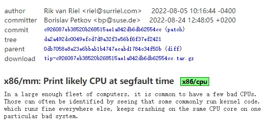然而这么多年来,出问题的 CPU 的故障模式是非常具体的,你可能在 bash、python 或各种系统守护程序中找到分段错误,然而故障消息不会告诉你是哪个 CPU 出了问题。现在我们将 printk () 添加到 show_signal_msg () ,就可以在分段错误时打印对应的 CPU、内核和套接字。